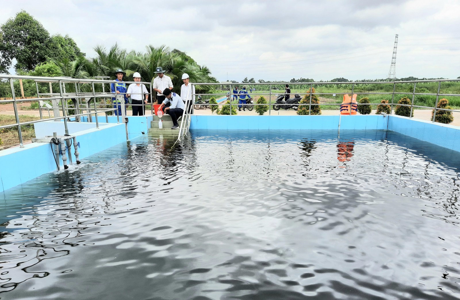 Cán bộ Trung tâm Quan trắc tỉnh lấy mẫu nước sau xử lý tại Nhà máy xử lý nước thải Tân Uyên