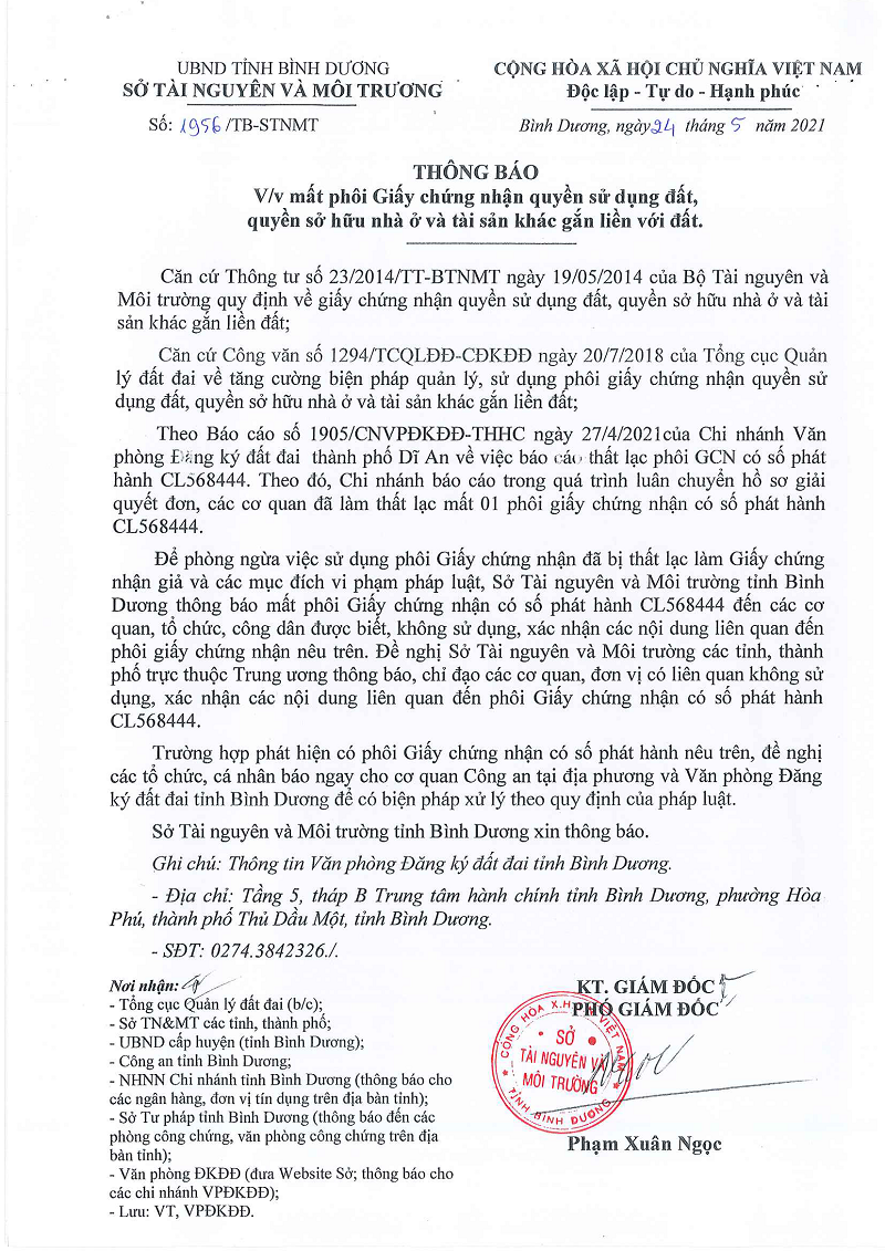 Để phòng ngừa việc sử dụng phôi Giấy chứng nhận đã bị thất lạc làm Giấy chứng nhận giả và các mục đích vi phạm pháp luật, Sở Tài nguyên và Môi trường tỉnh Bình Dương đã có Thông báo số 1956/TB-STNMT ngày 24/5/2021 về việc mất phôi Giấy chứng nhận quyền sử dụng đất, quyền sở hữu nhà ở và tài sản khác gắn liền với đất số CL568444.
