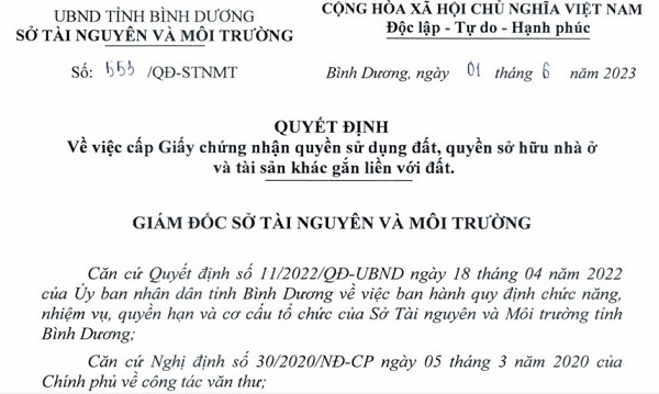 Ngày 01/06/2023, Sở Tài nguyên và Môi trường ban hành Quyết định số 553/QĐ-STNMT về việc cấp Giấy chứng nhận quyền sử dụng đất, quyền sở hữu nhà ở và tài sản khác gắn liền với đất.