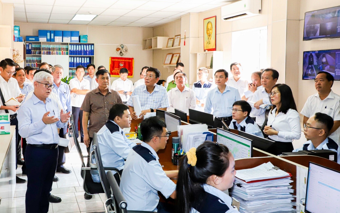 Bí thư Tỉnh ủy và đoàn công tác kiểm tra hệ thống quan trắc tự động và hình ảnh camera giám sát từ trạm quan trắc cơ sở được truyền về trạm điều hành trung tâm