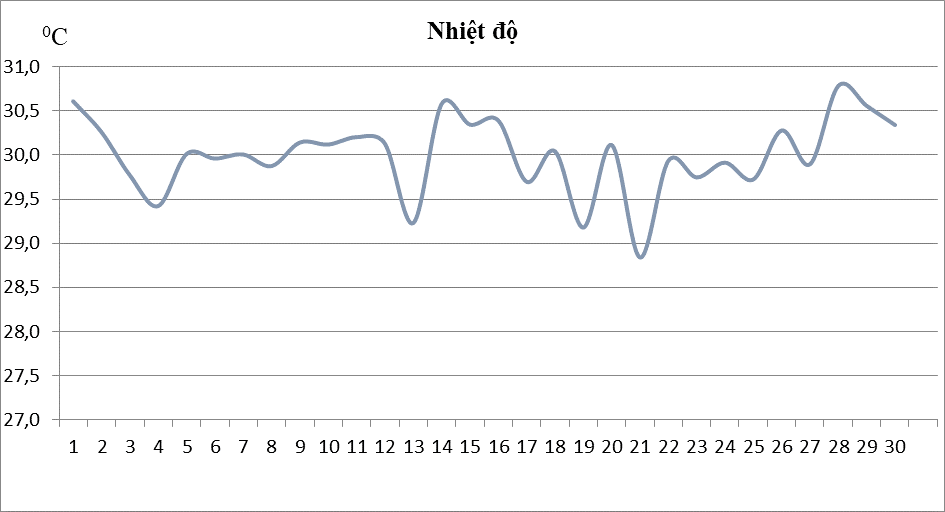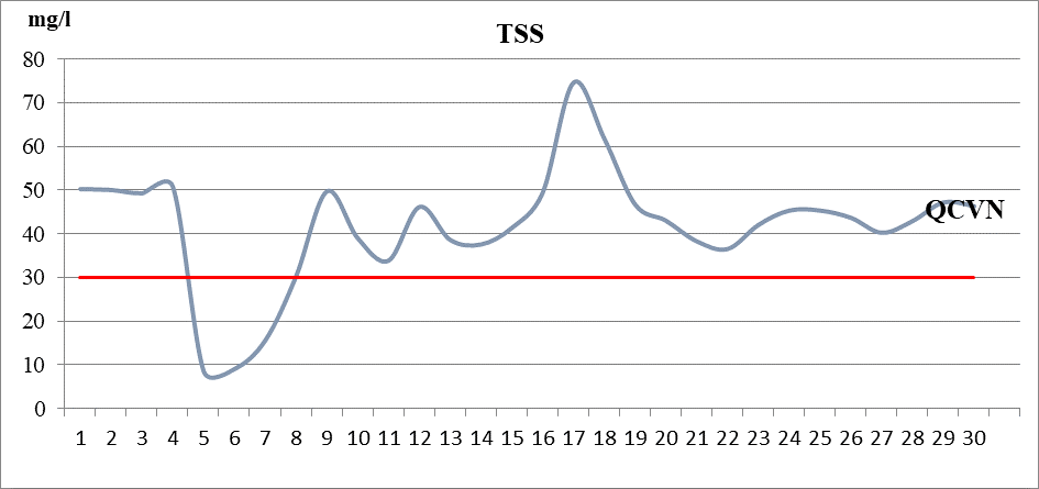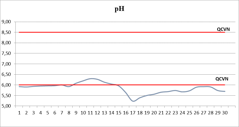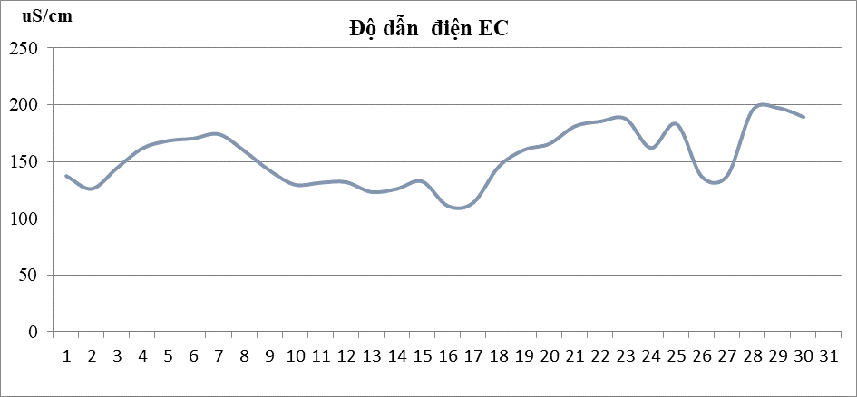 Kết quả quan trắc cho thấy thông số pH dao động từ 4,8 đến 6,8 trung bình là 5,8; Chỉ tiêu TSS biến động mạnh, dao động từ 26 đến 80 mg/l, bình quân 53 mg/l; DO dao động từ 0,1 đến 3,5 mg/l, bình quân 0,95 mg/l; Độ dẫn điện dao động từ 81 đến 259 µS/cm, bình quân tháng là 153 µS/cm; Nhiệt độ nước bình quân 29,1°C.