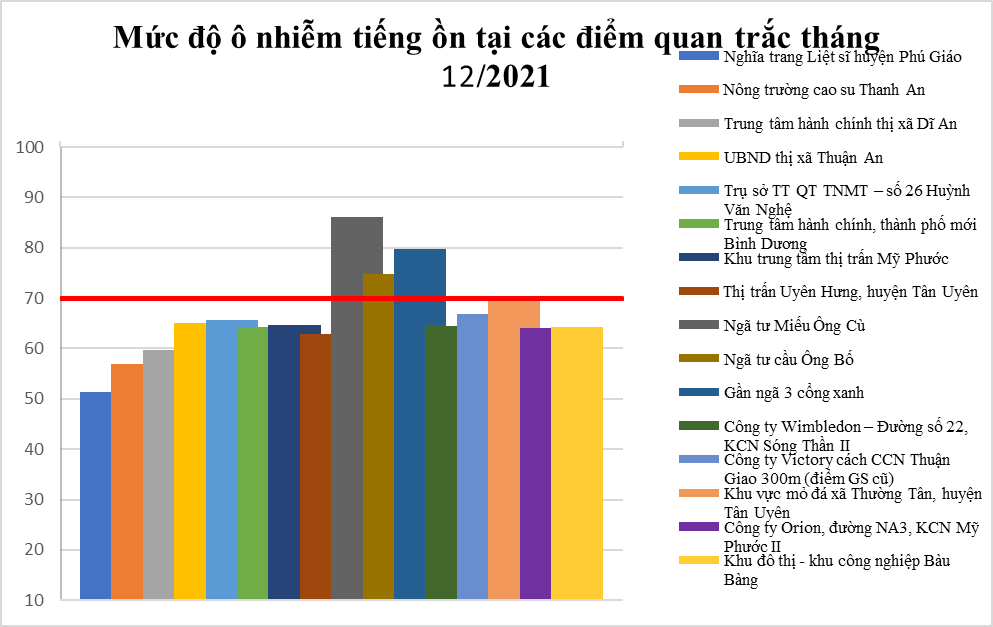 Kết quả quan trắc không khí tháng 12/2021 cho thấy nồng độ 14/17 thông số quan trắc (bụi tổng, bụi PM10, CO, NO2, SO2, O3, bụi chì, benzen, xylen, toluene, …) tại tất cả các điểm quan trắc đều dưới ngưỡng quy chuẩn cho phép so với QCVN 05: 2013/ BTNMT và QCVN 06: 2019/ BTNMT. Vị trí Ngã tư Miếu Ông Cù (GT1) vượt bụi TSP và bụi PM10 lần lượt 2,0 lần và 1,6 lần. Tiếng ồn đạt quy chuẩn cho phép ở hầu hết các vị trí quan trắc, vượt tại các vị trí giao thông lần lượt: GT1 vượt 16,2 dB(A); Ngã tư cầu Ông Bố (GT2) vượt 4,8 dB(A); Gần ngã 3 cồng Xanh (GT3) vượt 9,7 dB(A) và vị trí khu vực mỏ Đá Thường Tân, Tân Uyên (CN3) vượt nhẹ 0,3 dB(A) so với QCVN 26:2010/BTNMT.