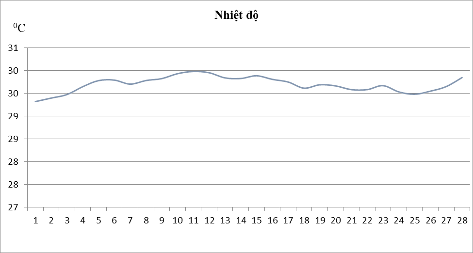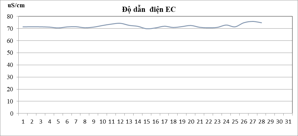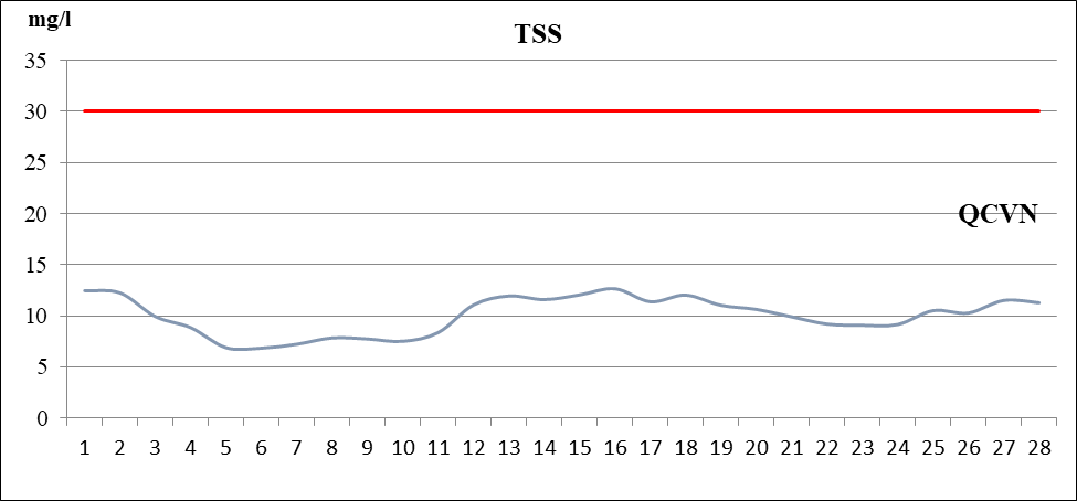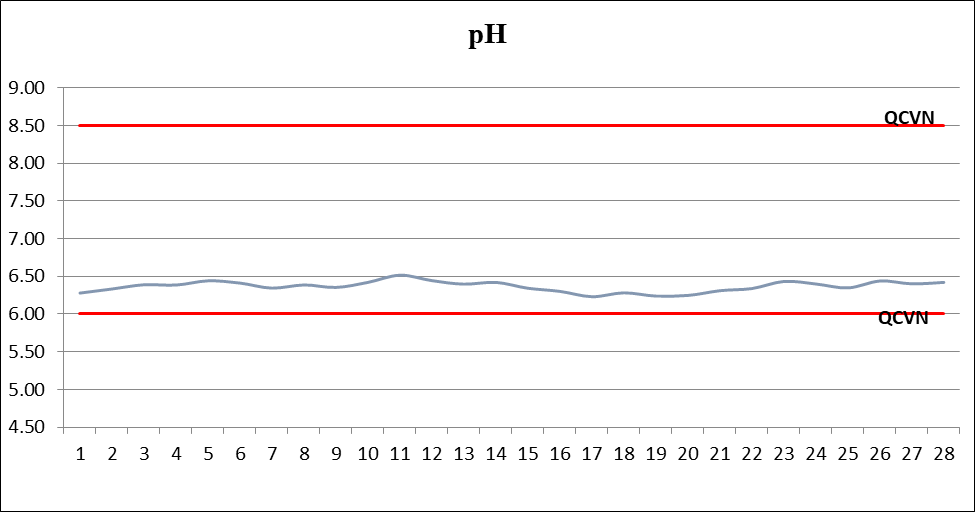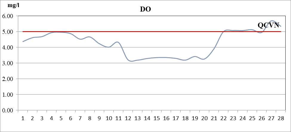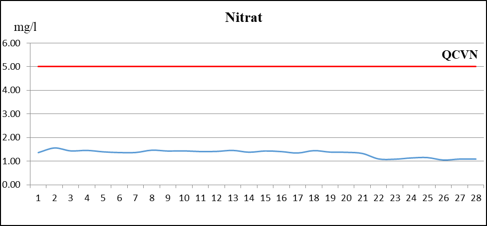 Kết quả quan trắc cho thấy thông số pH dao động ổn định, bình quân 6,4 và đạt QCVN08-MT:2015/BTNMT (cột A2); Nhiệt độ nước bình quân 29,7°C. TSS dao động mạnh từ 6 mg/l đến 22 mg/l, bình quân 10 mg/l; Chỉ tiêu Nitrat bình quân là 1,3 mg/l nhỏ hơn QCVN.