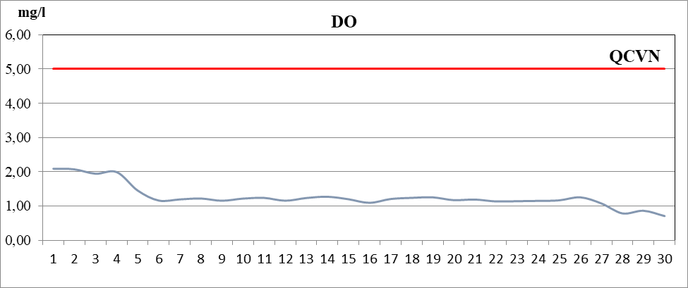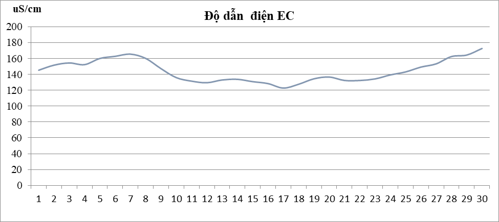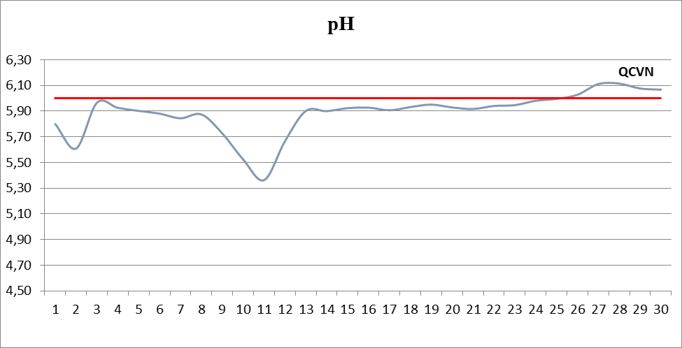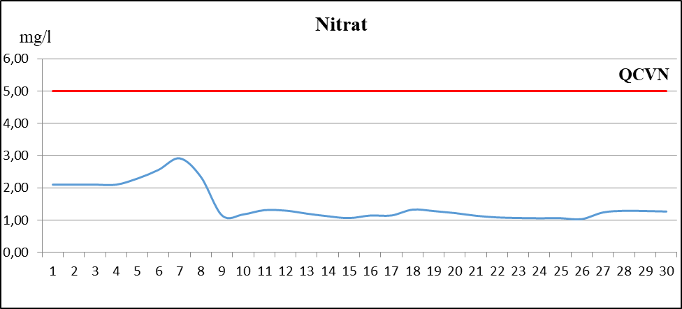 Các chỉ tiêu pH, Nitrat dao động ổn định và đều đạt QCVN 08-MT:2015/BTNMT (cột A2); pH dao động từ 5,4 đến 6,1, bình quân 5,8. Chỉ tiêu Nitrat bình quân 1,48 mg/l; Chỉ tiêu TSS dao động từ 7,43 mg/l đến 145,1 mg/l, bình quân 64,8 mg/l;