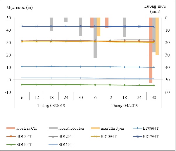 Tháng 04 năm 2019 là tháng cuối mùa khô, lượng nước dưới đất tháng 04 tăng nhẹ so với tháng 3, mực nước tăng từ 0,05 m đến 0,23 m. So với cùng kỳ năm 2018, mực nước bình quân ở các khu vực giảm nhẹ từ 0,59 m đến 0,64 m; riêng khu vực An Tây có mực nước tăng 1,13 m. So với cùng kỳ giai đoạn 5 năm trước, mực nước bình quân trong tầng Pleistocen giữa trên có xu hướng tăng, khu vực tăng mạnh nhất nằm ở An Tây - Bến Cát.