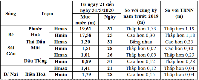 Bảng 2: Các đặc trưng thuỷ văn 11 ngày qua (21 – 31/5/2020)