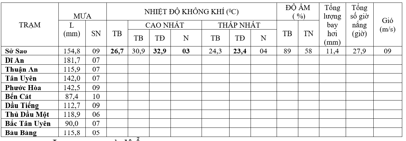 Tổng lượng mưa trong tuần qua ở các nơi cao hơn so với TBNN phổ biến từ 11 – 80mm, riêng Bến Cát thấp hơn TBNN 8mm. Lượng mưa trong 24 giờ lớn nhất ghi nhận là 77,9mm xảy ra tại Dĩ An ngày 05/10. Độ ẩm không khí trung bình 89% xấp xỉ TBNN, độ ẩm thấp nhất 58% xảy ra ngày 03/10. Tổng lượng bay hơi: 11,4 mm thấp hơn TBNN 4,1mm. Tổng số giờ nắng: 27,9 giờ thấp hơn TBNN 26,1 giờ. Gió mạnh nhất: 09m/s hướng Tây Tây Nam xảy ra ngày 03/10.
