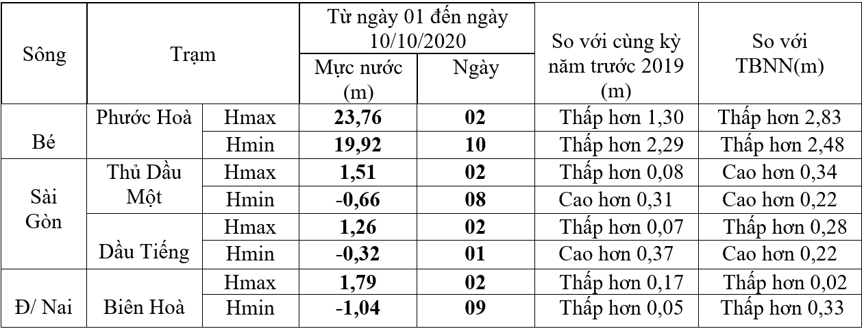 Bảng 2: Các đặc trưng thuỷ văn 10 ngày qua (01-10/10/2020)