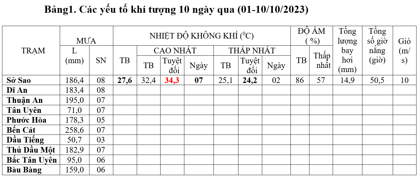 Tuần qua, lượng mưa ở các nơi phổ biến cao hơn hơn so với TBNN từ 59 – 164mm, riêng Tân Uyên và Dầu Tiếng thấp hơn TBNN lần lượt là 35,2 mm và 50,5mm. Lượng mưa trong 24 giờ lớn nhất là 155mm xảy ra tại Phước Hòa ngày 03/10. Độ ẩm không khí trung bình 86% thấp hơn TBNN 3%, độ ẩm thấp nhất 57% xảy ra ngày 06, 07/10. Tổng lượng bay hơi là 14,9mm thấp hơn TBNN 0,6mm. Tổng số giờ nắng: 50,5 giờ thấp hơn TBNN 2,8 giờ. Gió mạnh nhất: 10m/s hướng Tây Tây Bắc xảy ra ngày 02/10.