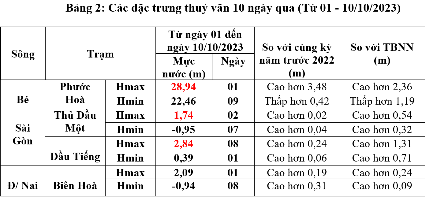 - Biên độ mực nước tại các trạm trong tuần qua tại Phước Hòa: 6,48m, Thủ Dầu Một 2,69m, Dầu Tiếng 2,45m và Biên Hòa 3,03m.