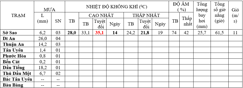 Lượng mưa phổ biến ở mức xấp xỉ so với TBNN cùng thời kỳ. Nhiệt độ trung bình cao hơn so với TBNN cùng thời kỳ. Lượng mưa dự báo phổ biến: 10 – 30mm. Nhiệt độ không khí trung bình: 27 – 280C; cao nhất tuyệt đối: 33 – 350C; thấp nhất: 21 - 230C.