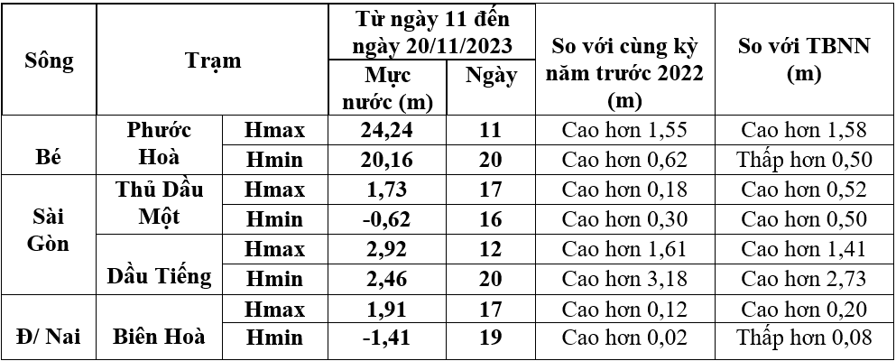 Bảng 2: Các đặc trưng thuỷ văn 10 ngày qua (Từ 11 - 20/11/2023)