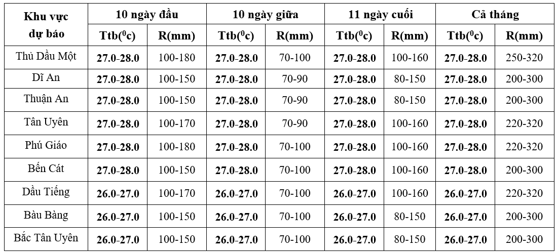 Tuần cuối (10 ngày cuối): Gió mùa tây nam có cường độ trung bình đến mạnh. Đề phòng khả năng xuất hiện bão hoặc ATNĐ trên Biển Đông. Trên cao, áp cao cận nhiệt đới có trục đi qua khu vực Bắc bộ. Thời tiết tỉnh Bình Dương phổ biến có mưa từ rải rác đến nhiều nơi, có nơi mưa to đến rất to. Đề phòng lốc, sét, mưa lớn cục bộ và gió giật mạnh trong những cơn mưa dông. Tổng lượng mưa xấp xỉ và cao hơn TBNN cùng thời kỳ, phổ biến từ 80-160mm. Nhiệt độ trung bình cao hơn TBNN cùng thời kỳ từ 0.2-0.4 độ.