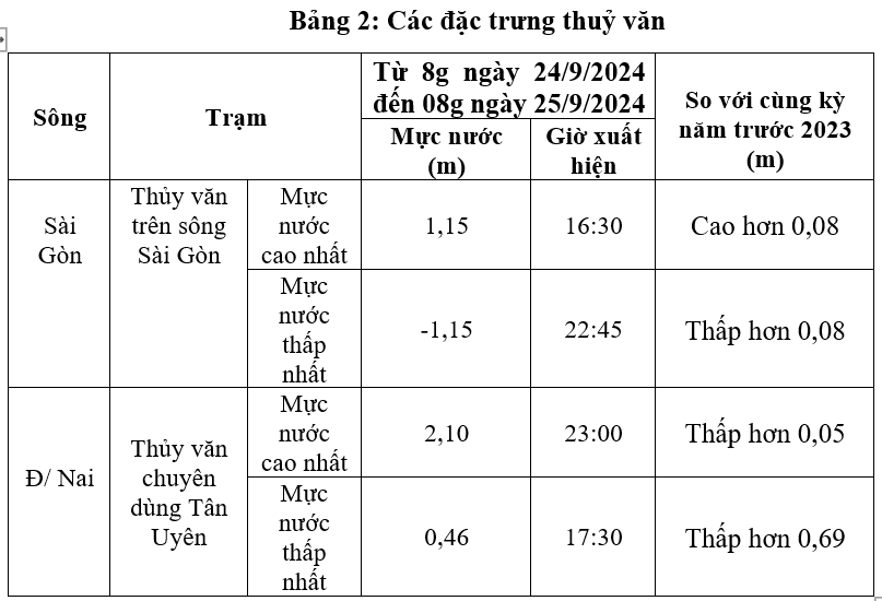 Số liệu được tính từ 8 giờ ngày 24/9/2024 đến 08 giờ ngày 25/9/2024 tại 02 trạm thủy văn chuyên dùng do Sở Tài nguyên và Môi trường quản lý
