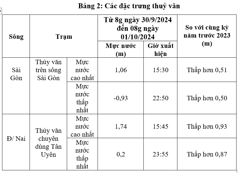 Số liệu quan trắc thủy văn trong 24 giờ (số liệu được tính từ 8g ngày 30/9/2024 đến 08g ngày 01/10/2024) tại 02 trạm thủy văn chuyên dùng do Sở Tài nguyên và Môi trường quản lý