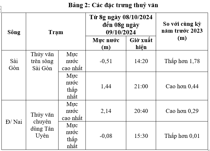 Số liệu quan trắc thủy văn trong 24 giờ (số liệu được tính từ 8g ngày 08/10/2024 đến 08g ngày 9/10/2024) tại 02 trạm thủy văn chuyên dùng do Sở Tài nguyên và Môi trường quản lý
