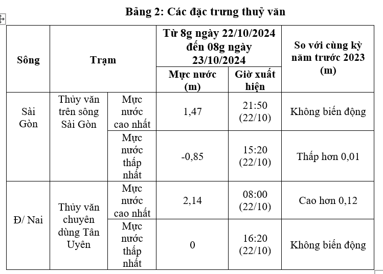 Số liệu quan trắc thủy văn trong 24 giờ (số liệu được tính từ 8g ngày 22/10/2024 đến 08g ngày 23/10/2024) tại 02 trạm thủy văn chuyên dùng do Sở Tài nguyên và Môi trường quản lý