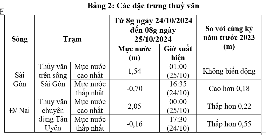 Số liệu quan trắc thủy văn trong 24 giờ (số liệu được tính từ 8g ngày 24/10/2024 đến 08g ngày 25/10/2024) tại 02 trạm thủy văn chuyên dùng do Sở Tài nguyên và Môi trường quản lý