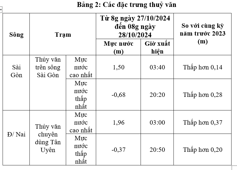 Số liệu quan trắc thủy văn trong 24 giờ (số liệu được tính từ 8g ngày 27/10/2024 đến 08g ngày 28/10/2024) tại 02 trạm thủy văn chuyên dùng do Sở Tài nguyên và Môi trường quản lý