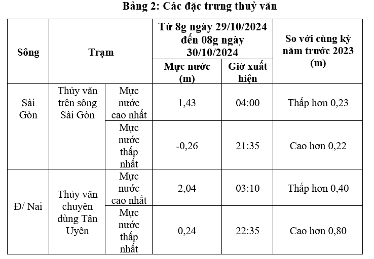 Số liệu quan trắc thủy văn trong 24 giờ (số liệu được tính từ 8g ngày 29/10/2024 đến 08g ngày 30/10/2024) tại 02 trạm thủy văn chuyên dùng do Sở Tài nguyên và Môi trường quản lý