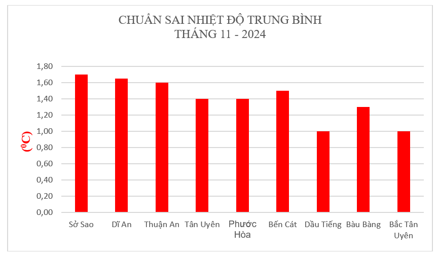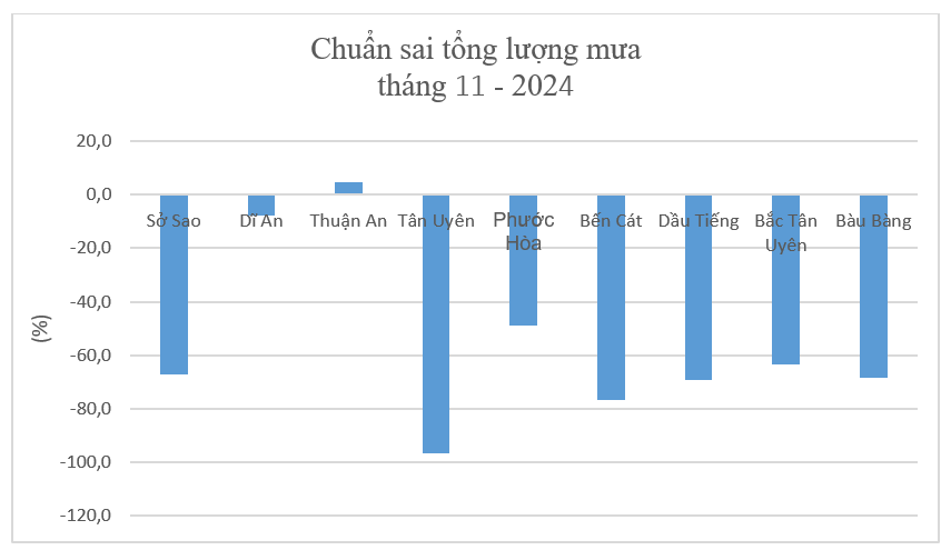 Trong tháng, tổng lượng mưa ở các nơi phổ biến thấp hơn so với TBNN từ 10 – 98%, riêng Thuận An cao hơn TBNN 5,6%. Lượng mưa trong 24 giờ lớn nhất là 80,9mm tại Thủ Dầu Một ngày 09/11.