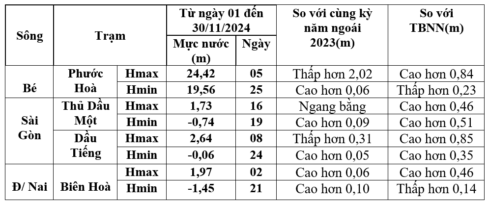 Bảng 2. Các trị số đặc trưng thuỷ văn trong tháng 11 năm 2024