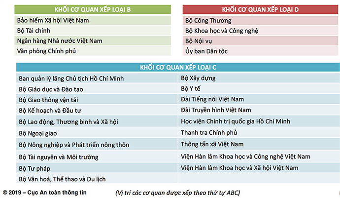 Trong đó, Bộ Công thương, Bộ KH&CN, Bộ Nội vụ và Uỷ ban Dân tộc là những đơn vị được đánh giá thấp nhất (loại D), tức mới chỉ bắt đầu quan tâm đến ATTT.