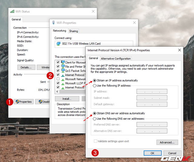 Trong cửa sổ trạng thái của kết nối đã chọn, hãy nhấn vào nút Properties trong phần Activity và tiếp theo nhấn đúp vào Internet Protocol Version 4 (TCP/IP v4). Hãy đảm bảo rằng các tùy chọn "Obtain an IP address automatically" và "Obtain DNS server address automatically" đang được đánh dấu. Khi đó, hệ thống sẽ tự động được gán IP từ modem hoặc router một cách chính xác. Bạn có thể lặp lại các bước tương tự với địa chỉ IPv6 ở phần Internet Protocol Version 6 (TCP/IP v6).