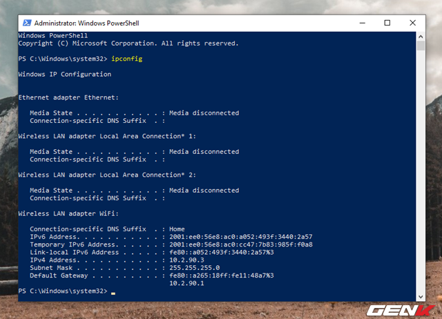 Khi đã thực hiện các bước thiết lập trên, bạn có thể kiểm tra thêm để chắc chắn rằng máy tính đang được router cấp một địa chỉ IP hợp lệ. Hãy mở giao diện dòng lệnh Windows PowerShell bằng cách nhấn phải chuột vào nút Start và chọn Windows PowerShell (Admin). Tiếp theo, gõ lệnh "ipconfig" và tìm thông tin bên dưới phần Ethernet adapter (đối với kết nối có dây) hoặc Wireless LAN Adapter (đối với kết nối không dây).