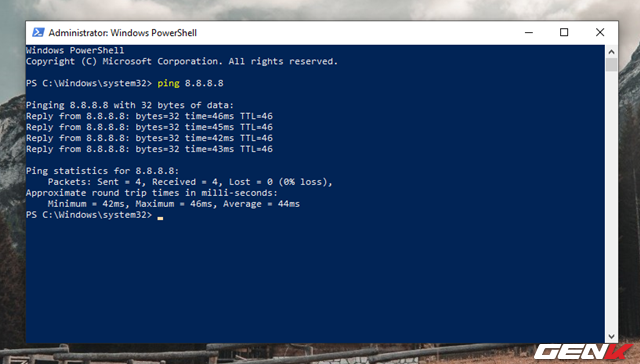 Chúng ta tiếp tục giải quyết bằng cách hãy thử gõ lệnh "ping 8.8.8.8" đến các máy chủ DNS của Google để kiểm tra xem máy tính có thể kết nối được ra ngoài Internet hay không. Thao tác trên sẽ gửi 04 gói tin đến Google.