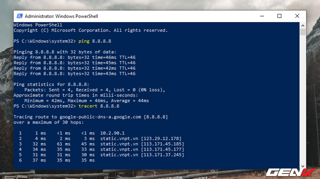 Nếu thất bại, bạn sẽ nhận được thông báo gói tin nào gặp vấn đề trong khi gửi. Để biết thêm chi tiết, hãy gõ lệnh "tracert 8.8.8.8" nhằm theo dõi đường đi của từng gói tin giữa máy tính của bạn và các máy chủ DNS của Google.