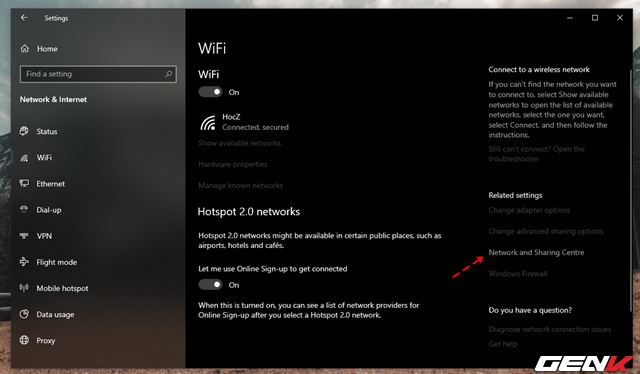 Cụ thể, để kiểm tra điều này, hãy nhấn phải chuột vào biểu tượng mạng ở khay hệ thống và chọn lệnh "Network and Sharing Center".
